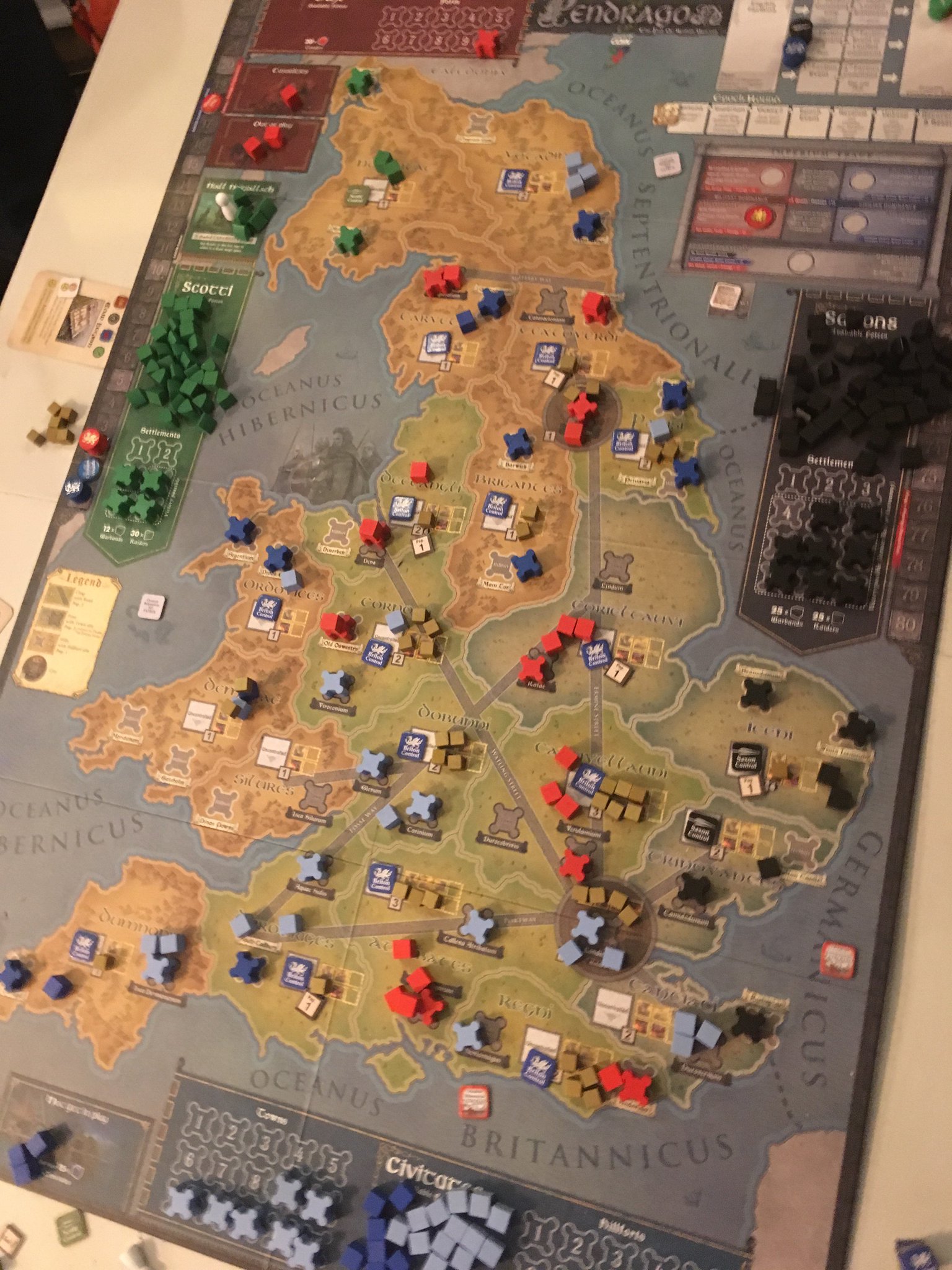 I played as the Civitates within my first game of Pendragon: they are basically the nobles and civilian elites that helped to rule Roman Britain. The other Briton faction is the Dux: the remains of the Roman Army, trying to either keep ties with the empire, or control Britain on their own. What truly amazed me as the Civitates is the amount of distaste I had for my erstwhile Dux ally by the end of the game: my Dux opponent had made it a mission to drive down my resources and wealth, to the extent that I couldn't wait for Britain to fragment so that he couldn't use up my precious resources.